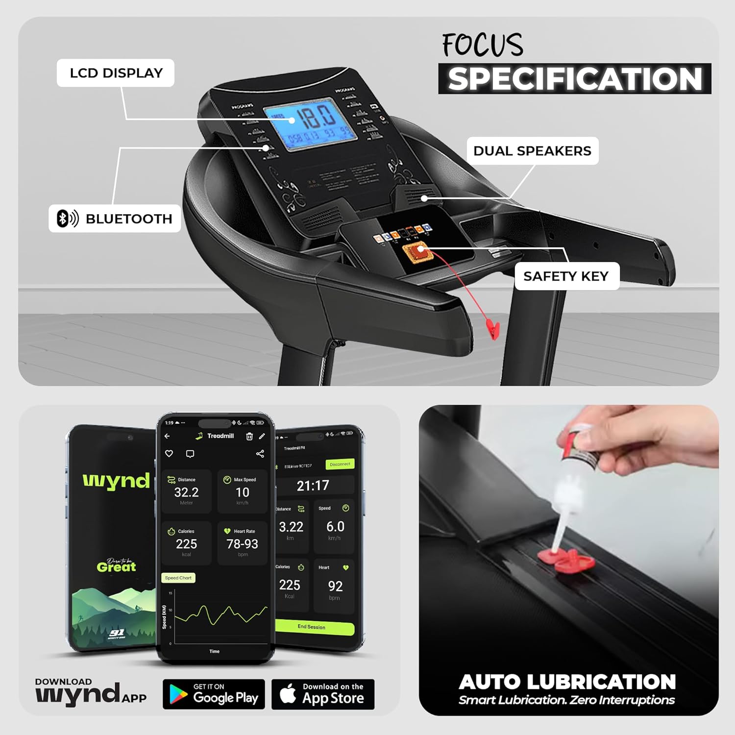 【 Powerful & Efficient BLDC Motor 】 – Equipped with a 7 HP Peak BLDC motor, this treadmill offers high efficiency, reduced noise, and longer lifespan. The motor ensures smooth operation for interval, speed, and endurance training, with a speed range of 1 to 18 km/h for a customized workout.